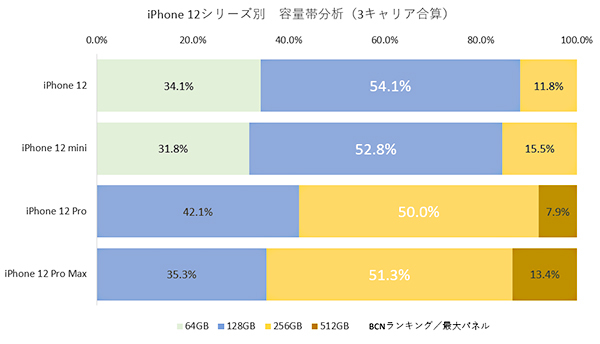 シリーズ別の容量帯では、iPhone 12が54.1%、iPhone 12 miniが52.8%で128GBが過半数を占めた。一方、iPhone 12 ProとiPhone 12 Pro MAXでは256GBが最も高いシェアとなっている。(BCN・大蔵 大輔)