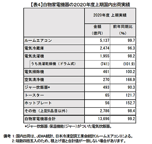 日本電機工業会(JEMA)は11月19日、2020年度上期の電気機器の状況に関する記者会見を開催。白物家電の国内出荷金額は1兆3696億円(前年同期比99.2%)の微減だった。