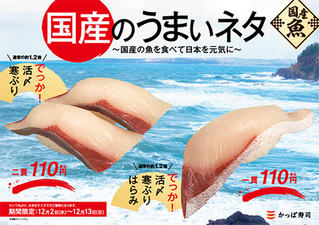 コロワイドグループのかっぱ寿司は、全国各地の漁港を応援する「国産魚のリレー販売プロジェクト」を開始する。第1弾として12月2~13日の期間、「でっか!活〆寒ぶり」「でっか!活〆寒ぶりはらみ」を販売する。
