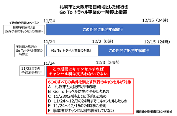 札幌市と大阪市を目的地とする旅行の当面の措置内容は次の三つ。(1)11月24日~12月15日24時までに出発する旅行の新規予約でGo To トラベル事業の適用を一時停止、(2)12月2日0時~15日24時までに出発する既に予約済みの旅行もGo To トラベル事業の適用を一時停止、(3)11月23日24時までにGo To トラベル事業の対象として予約した旅行は、11月24日~12月3日24時までに旅行会社にキャンセルを申し出る――。