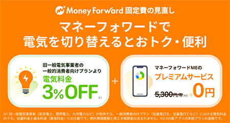 同サービスを利用して電気の切り替えを行うと、東京電力や関西電力といった旧一般電気事業者の一般消費者向けプランと比較して、3%オフの料金で利用可能になるほか、電気契約の有効期間中は「マネーフォワード ME」のプレミアムサービスを無料で使える。
