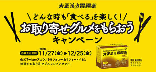大正製薬は、豪華お取り寄せグルメが合計50人に当たる「どんな時も『食べる』を楽しく!お取り寄せグルメをもらおうキャンペーン」を「大正漢方胃腸薬」のTwitterアカウントで11月27日に開始した。同社では、日々の生活に欠かせない「食べる」ことによって楽しい時を過ごしてほしいとの判断でキャンペーンを実施することにした。