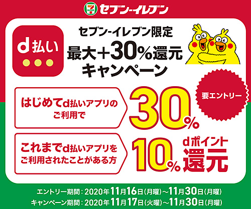 単体でコラボしているセブン-イレブンの最大30%還元キャンペーンもおすすめだ。1回税込み700円以上をd払いで支払うと、通常付与するポイントに加え、10%を付与するキャンペーンで、初めてであれば還元率は30%にアップする。還元上限は1000ポイント。期間は11月30日まで。