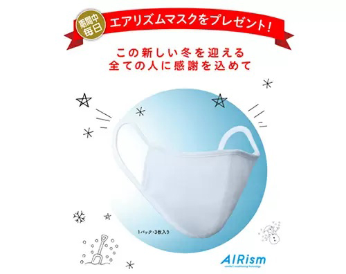 税別1万円以上の買い物をした利用者に配布するエアリズムマスクは3枚入りを一つ。店頭の場合でその場、オンラインで次回の買い物で使えるエアリズムマスク1点無料クーポンをプレゼントする。