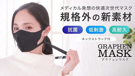 「呼吸がしやすく付け心地が快適なマスクがなくて困っている」との声に応えるため、素材として「グラフェン」を使用。した最新マスク。飛沫をシャットアウトするために撥水コーティングをおこない、マスクとしての本来の性能を確保している。清潔なマスク生活が送ることができるよう、ネックストラップを標準装備した。