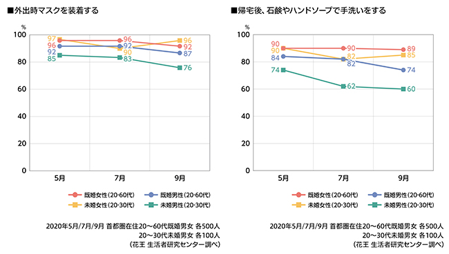 「マスクを洗濯・手入れして繰り返し使う」は、緊急事態宣言前後の使い捨てマスクの品薄から、「布製マスク」が広まったことや、「マスクの洗い方」の情報も増えたことなどが影響していると考えられる。布製マスクは、手作りの楽しさや見た目のおしゃれ感はもとより、暑い夏でもほぼ毎日マスクが必要となった「新しい生活様式」で、経済性やつけ心地の面でも歓迎され、定着してきたようだ。