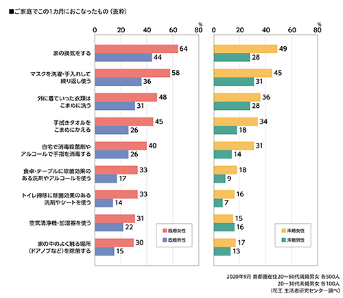 新型コロナウイルスの流行後、9月時点での自宅でのその他の対策としては「家の換気をする」が最も高く、次いで「マスクを洗濯・手入れして繰り返し使う」、「外に着ていった衣類はこまめに洗う」、「手拭きタオルをこまめにかえる」などが高い結果となった。また、当初から推奨されてきた「家の中のよく触る場所(ドアノブなど)を除菌する」は、既婚女性の3割が実施していた。