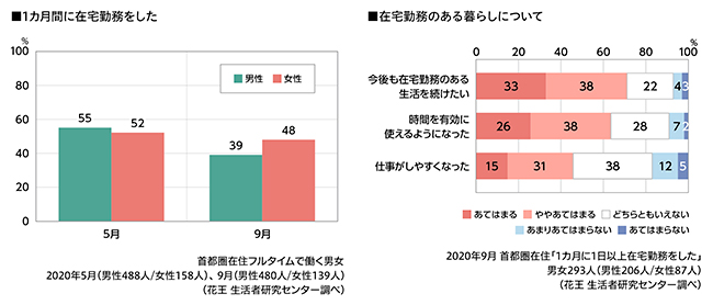 緊急事態宣言が継続していた5月は、フルタイム勤務者のうち半数以上が「在宅勤務」を経験。9月には、やや低下したものの、男性で約4割・女性で約5割となっており、新しい働き方として定着しつつあると推測される。