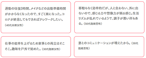 在宅勤務経験者の反応をみると、「今後も在宅勤務のある生活を続けたい」、「時間を有効に使えるようになった」、「仕事がしやすくなった」と歓迎する声が多くなっている。理由として生活者からは、通勤時間がなくなったことによる心身の負担軽減や、家族と過ごす時間・自分時間の充実などが挙げられていた。一方、2割弱の人が在宅では仕事がしやすくないとも回答している。