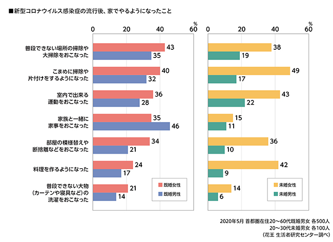 外出自粛や在宅勤務によって「ステイホーム(おうち時間)」を快適に過ごすことにも関心が高まった。新型コロナの流行後、家でやるようになったこととしては、「普段できない場所の掃除や大掃除」「こまめに掃除や片付け」「部屋の模様替えや断捨離」などの家事に注力したり、「家族と一緒に家事」をすることで家族で協力して住まいの居心地を良くしようとする人も多かったようだ。