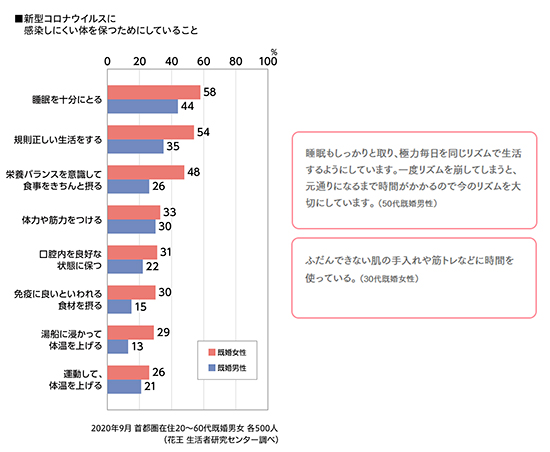 また、新型コロナに感染しにくい体を保つために、「十分な睡眠」「規則正しい生活」「栄養バランスを意識した食事」といった健康的な生活習慣の維持はもとより、「体力や筋力をつける」「免疫に良いといわれる食材を摂る」「湯船に浸かって・運動して体温を上げる」などを積極的に実践している人もみられた。