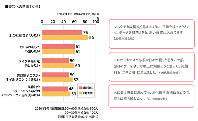 新型コロナの流行前に比べて外出機会が減った状況は続いているが、女性の間では、今だからこそ「肌の状態をよくしたい」「メイクや髪型を楽しみたい」と考えてマスクに合うメイクなどを工夫したり、いつかは「おしゃれをして外出したい」と前向きな思いをもつ人も多いことがわかった。