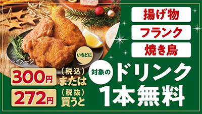 セブン‐イレブンは、揚げ物やフランク、焼き鳥を一度に税込み300円(税別272円)分を購入すると対象のドリンク1本が無料になるキャンペーンを12月7日までの期間限定で実施している。購入するとレシートに無料引換券が印字される仕組みなので、誰でも参加できる。