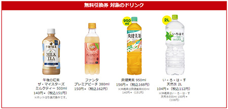 無料引換券の対象ドリンクは、「午後の紅茶 ザ・マイスターズミルクティー 500ml(税込み151円)」「ファンタ プレミアピーチ 380ml(162円)」「爽健美茶 950ml(168円)」「い・ろ・は・す 天然水 2L(112円)」のいずれか。ドリンクの引き換え期間は12月14日まで。