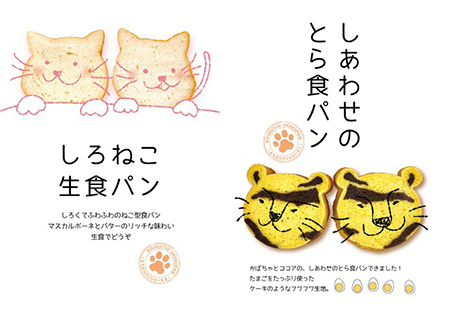 しろねこ生食パンは、マスカルポーネとバターを使用した、白くてふわふわのねこ型食パン。「生」のまま食べると、しっとりとした口当たりが楽しめる。しあわせのとら食パンは、卵をたっぷりと使用したケーキのような生地が特徴のとら型食パン。かぼちゃとココアを生地に練り込み、ふわふわ食感に仕上げている。