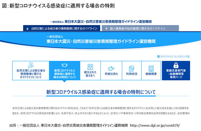 ここでは、「制度を知ってもらう」ことを目的にしており、主だった項目名のみを記している。そのため、内容の詳細は「一般社団法人 東日本大震災・自然災害被災者債務整理ガイドライン運営機関」(http://www.dgl.or.jp/covid19/)のサイトを確認してほしい。
