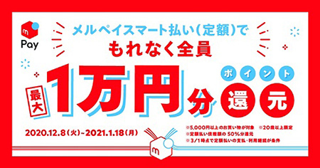 メルペイは、12月8日に「年末年始まるっと還元キャンペーン」を開始。メルペイスマート払い(定額)で5000円以上支払うともれなく50%分のポイントが還元される。合わせて、抽選で3万人に1万ポイントが当たるWチャンスもある。期間は1月18日まで。