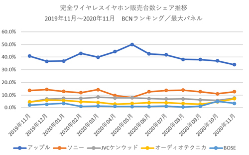 メーカーシェアでは、アップルが3割強を占めてトップをキープ。ただ、5月をピークに徐々に落ちており、競合各社の成長がうかがえる。2番手以降は、ソニー、JVCケンウッド、オーディオテクニカ、ボーズの順で並ぶ。いずれも、販売台数前年比ではアップルを上回っている。