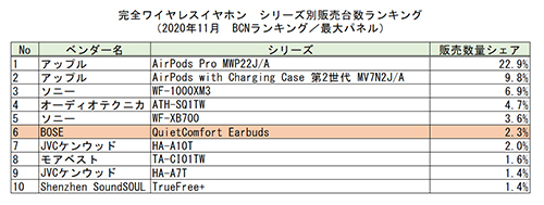 シリーズ別の販売台数シェアランキングでは「AirPods Pro」が22.9%で首位。前月の24.5%から1.6ポイント落とした。ソニーは、ロングセラーモデル「WF-1000XM3」や夏発売の「WF-XB700」が好調。赤丸急上昇は、ボーズの「QuietComfort Earbuds」。10月発売で3万円を超える高級機ながら6位にランクインした。(BCN・大蔵 大輔)