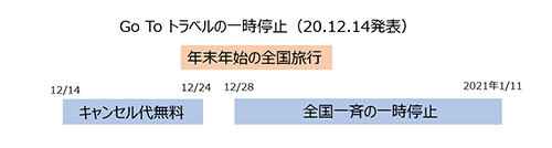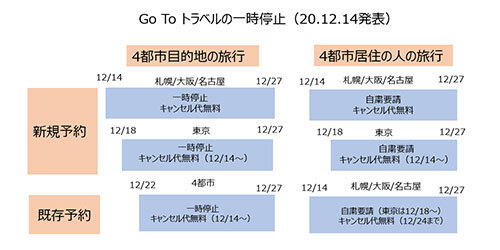 新規や既存の予約を問わず、12月28日0時~2021年1月11日24時までに出発する同事業を使った旅行(12月28日以前に出発して同期間にする旅行も含む)は、特定の地域にかかわらず適用を一時停止する。