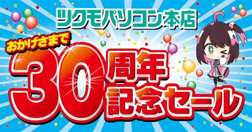 TSUKUMO(ツクモ)ブランドでPCやPC周辺機器を販売するProject Whiteは、東京・秋葉原のツクモを代表する「ツクモパソコン本店」がオープン30周年を迎えることを記念し、「ツクモパソコン本店30周年記念セール」を12月15日から開催する。