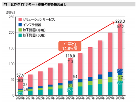 その中で、ITリモート市場の世界需要額は年平均14.8%で成長し、30年に228.3兆円となり、20年比で約4倍に拡大する見通しを示した。中核となるソフトウェアによるソリューションサービスは、30年に143兆円の規模になる見通し。