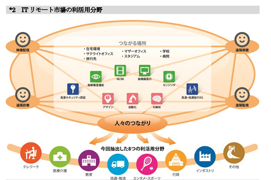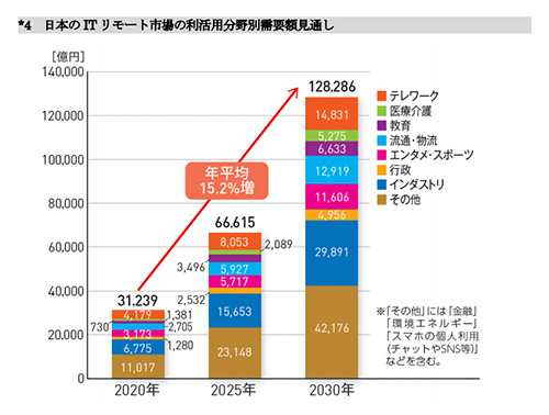 日本国内におけるITリモート市場も、30年に12.8兆円となり、20年比で約4倍に拡大する見込み。八つの分野のうち、日本における30年に大きくなるのは、インダストリ(2.9兆円)、テレワーク(1.4兆円)、流通・物流(1.2兆円)、エンタメ・スポーツ(1.1兆円)の4分野との見通しを示した。