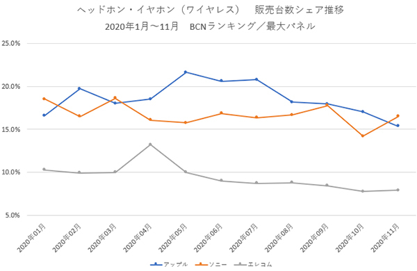 全国の家電量販店やECショップでPOSデータを集計する「BCNランキング」によると、2020年1月~11月のイヤホン・ヘッドホン(ワイヤレス)販売台数シェアの1位はアップル。市場ではケーブルのあるモデルの比率が高かったが、完全ワイヤレスイヤホンが急成長しており、ラインアップがAirPodsのみのアップルが大きくシェアを伸ばした。