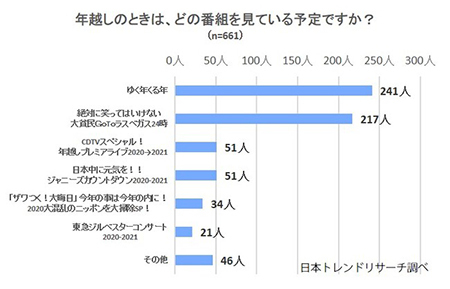 NEXERが運営する日本トレンドリサーチは、「年越し番組」に関するアンケートを実施し、その結果を公開した。調査期間は12月15日から16日。集計対象人数は900人(男女450人ずつ)。