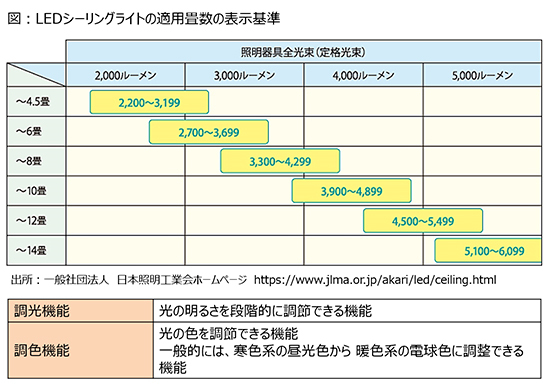 まず、「適用畳数」だが、LEDシーリングはW(ワット)表示ではなく、ルーメンが用いられている。図は、LEDシーリングライトの適用畳数の表示基準だが、例えば6畳なら2700~3699ルーメンなどと畳数に幅があることがわかる。この場合、6畳なら3699ルーメンにできる限りMAX値に近い商品を選ぶと、より快適な明るさが得られる。