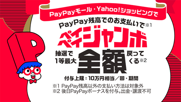 PayPayでは早くも1月からのキャンペーンも決定している。1月12日に開始する「ペイペイジャンボ」はPayPayモール・Yahoo!ショッピングでPayPay残高支払いすると抽選で全額が戻ってくるというもの。戻ってくる金額の内訳は現在の「ペイペイジャンボ(オンライン)」と同様だ。