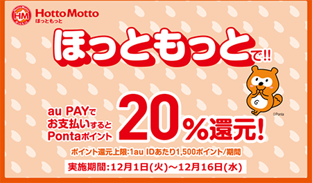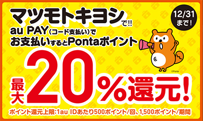 還元上限はマツモトキヨシが1au IDあたり500ポイント/回、1500ポイント/期間、オーケーが1au IDあたり800ポイント/回、2500ポイント/期間。ほっともっとが1au IDあたり1500ポイント/期間、百貨店・アパレル・ショッピングセンターは1au IDあたり500ポイント/回、1500ポイント/期間。