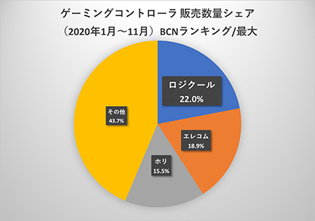 2020年は、ゲーミングコントローラ市場の成長が著しかった。コロナ禍で高まった巣ごもり需要の中でも、ゲームは特に注目を集めたからだ。全国の家電量販店やECショップのPOSデータを集計する「BCNランキング」によると、販売数量は20年1~11月に前年同期比56.1%増と大きく伸びている。11月までの人気メーカーは、ロジクールだが、2位と僅差。年間No.1の行方は未知数だ。