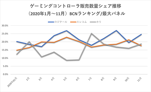 20.0~25.0%のシェアを維持し続けるロジクールに対し、エレコムは20.0%前後で推移している。ホリは、2月に20.0%台までシェアを伸ばしたが、3~6月のコロナ禍による外出自粛期間中にシェアを10.0%前後まで落としたことが大きく影響しているとみられる。7月にはシェアを25.2%まで回復させたが、その後は15.0%前後で推移している。