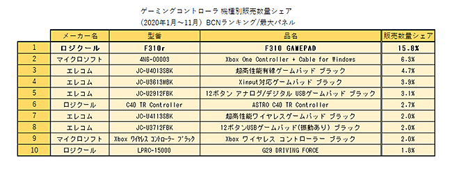 1~11月までの集計で最も人気だった製品は、ロジクールの「F310 GAMEPAD」で、15.8%のシェアを占めている。2位のマイクロソフト「Xbox One Controller + Cable for Windows」と9.5ポイント差だ。