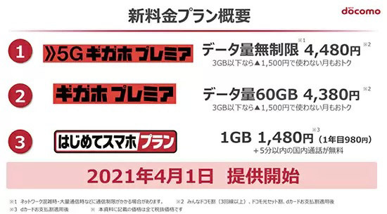 NTTドコモは大容量プラン「5Gギガホ」を「5Gギガホ プレミア」に、「ギガホ」を「ギガホ プレミア」に一新する。提供開始は2021年4月1日で、新規申込が必要。固定回線のコラボモデル「ドコモ光」の契約(本人または同一「ファミリー割引」グループ内の家族)があり、「ドコモ光セット割」と「みんなドコモ割(3回線以上)」が適用中なら、5Gギガホ/ギガホからプラン変更するだけで純粋に値下げとなる。