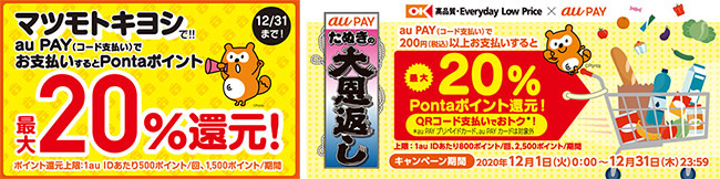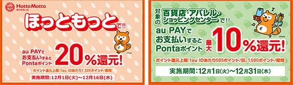 au PAYは「たぬきの大恩返しキャンペーン」と称して、12月にマツモトキヨシ・オーケー・ほっともっとで最大20%還元、百貨店・アパレル・ショッピングセンターで最大10%還元というキャンペーンを開催している。還元上限は、マツモトキヨシが1au ID当たり500ポイント/回、1500ポイント/期間、オーケーが1au ID当たり800ポイント/回、2500ポイント/期間。ほっともっとが1au ID当たり1500ポイント/期間、百貨店・アパレル・ショッピングセンターが1au ID当たり500ポイント/回、1500ポイント/期間。