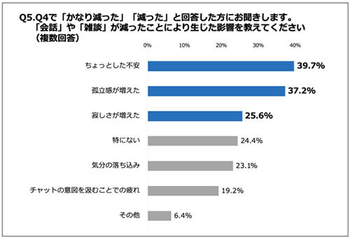 調査では、「出社時と比べ、テレワークでは『会話』や『雑談』をする時間は減りましたか?」と質問したところ、「かなり減った」が35.4%、「減った」が35.5%という回答になった。この影響について複数回答で尋ねると、「ちょっとした不安」が39.7%、「孤立感が増えた」が37.2%、「寂しさが増えた」が25.6%だった。