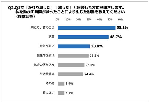 また、調査では「テレワークでは体を動かす時間は減りましたか?」と質問。回答は、「かなり減った」が41.8%、「減った」が29.1%だった。そのうち、具体的な影響として、「肩こり、首のこり」が55.1%、「肥満」が48.7%、「眠気が多い」が30.8%となった。