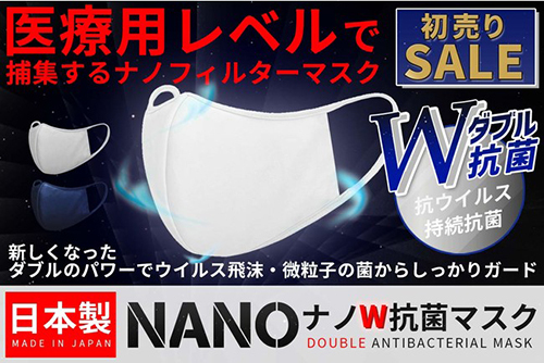 サムライワークスは、新型コロナ感染拡大に少しでも歯止めをかけるため、医療用レベルで飛沫防止ができる「ナノ抗菌マスク」をさらに進化させた「ナノW抗菌マスク」の初売りセールを開催、特別価格1枚1480円(税別)で追加販売した。通常価格は税別1980円。