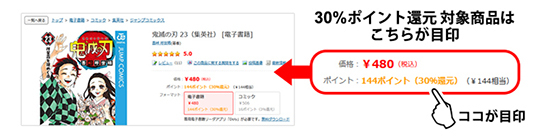 例えば、「鬼滅の刃」の第1巻なら税込み価格418円で購入すると、ヨドバシカメラの126ポイント(126円相当、30%還元)が付与される(1月6日時点)。