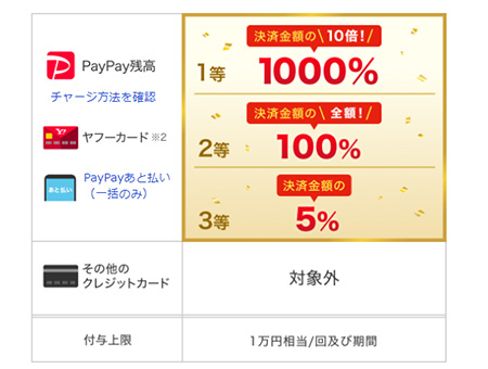 2等は100%(決済金額の全額)、3等は5%(決済金額の5%相当)のPayPayボーナスが付与される。5回の1回の確率で1~3等のいずれかが当たる。ポイントの付与条件は、1万円相当/回・期間となっている。なお、17歳未満は1等に当選しない。