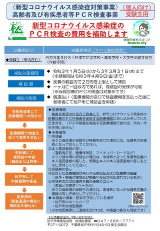 千葉県松戸市は、PCR検査補助事業の対象者に「高齢者施設等従事者の同居者」と「受験生」を1月5日から追加している。実施期間は21年3月まで。1件当たり2万円を上限として補助する。受験生をPCR検査費用の補助対象とすることは、県内初の取り組みとなる。