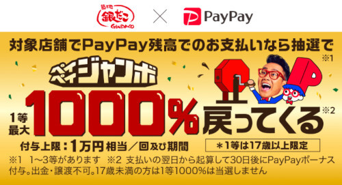 「ペイペイジャンボ」は1月8日に築地銀だこでも開始した。1等が1000%、2等が100%、3等が5%還元と、1等・2等であればペイペイジャンボ(オンライン)よりも還元率が10倍も高い。還元上限は1万円/回・期間となっているので、挑戦してみるとよいだろう。期間は1月21日まで。
