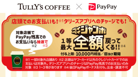 1月15日からはタリーズがPayPayに対応することを記念した「ペイペイジャンボ」も開催される。こちらは1等が100%、2等が10%、3等が2%還元で、還元上限は1万円/回・期間。期間は1月31日まで。