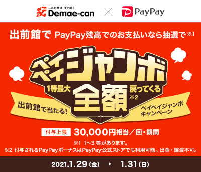 PayPayは昨年から開催されている抽選で決済金額の最大全額(100%)のPayPayボーナスを還元する「ペイペイジャンボ(オンライン)」が継続中。対象はオンラインストアで、還元上限は10万円相当/回・期間。当たりくじの内訳は1等が100%、2等が10%、3等が2%還元。1月11日までなので、狙っている店舗があるなら今週末が最後のチャンスだ。緊急事態宣言で需要が高まるであろうテイクアウトやデリバリーに対応する店舗も対象に含まれているので、ぜひ確認してみてほしい。今回のくじでは必ず5%~20%還元が受けられる「年末年始もオンラインがお得!」も一部店舗で並行して実施されているので、こちらも要チェックだ。