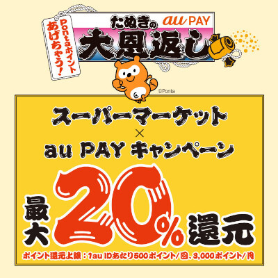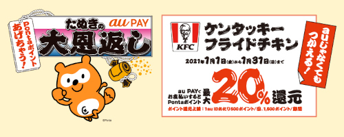12月に「たぬきの大恩返しキャンペーン」が好評だったau PAYは、1月も対象店舗を変えて同キャンペーンを継続する。お得になるのはケンタッキー・フライドチキンとスーパーマーケットだ。還元率はどちらも20%で、還元上限はケンタッキーが1au IDあたり500ポイント/回、1500ポイント/期間、スーパーが1au IDあたり500ポイント/回、3000ポイント/月。ケンタッキーは1月31日までだが、スーパーは3月22日までと長期間にわたるので、じっくり使えそうだ。