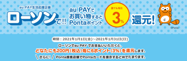 「au PAY生活応援企画」として昨年ロングランで実施された「ローソンで!! au PAYでお買い物するとPontaポイント誰でも毎日3%還元」も1月31日までの開催が決定。auポイントプログラムや三太郎の日などで還元率が上がるチャンスもあるので、おすすめだ。