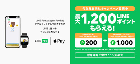 LINE Payは1月15日まで、LINEアプリ上からApple Payを初めて設定するとLINEポイント200ポイントもらえるキャンペーンを開催中。さらに期間中に合計2000円以上のApple Payでの支払いで1000ポイントが加算され、最大LINEポイント1200ポイントをもらうことができる。