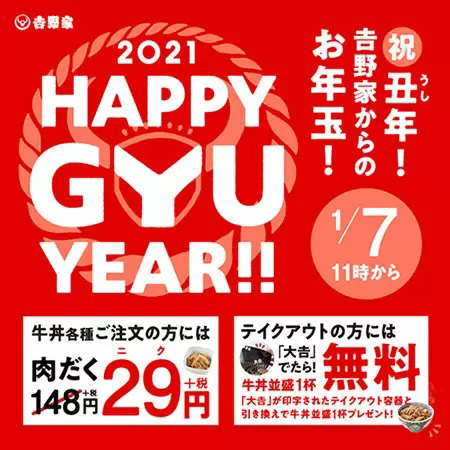 吉野家は1月7日11時~11日20時まで、2021年の丑年(うしどし)にちなんで、店内・テイクアウトで「牛丼」を注文した人を対象にお年玉企画「2021HAPPY GYU YEAR」を開催する。「肉だく」が特別価格になるほか、抽選で牛丼並盛が一杯無料になるキャンペーンだ。また、期間中は、通常148円(税別)の「肉だく」が約80%オフの29円になる。